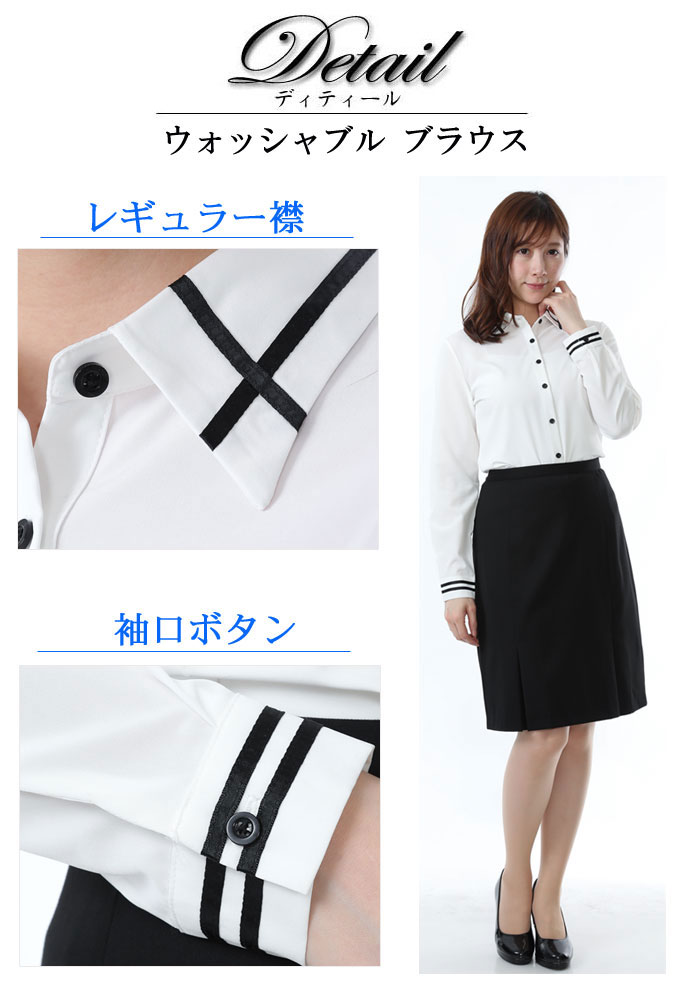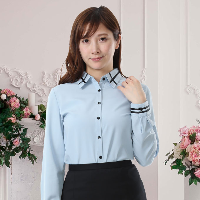 長袖ブラウス 水色黒ライン レギュラー襟 洗濯機で洗える