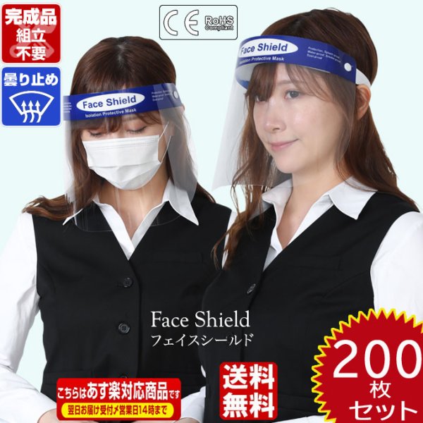 フェイスシールド 200枚 CE認証 高品質 軽量 くもり止め加工 組立不要 完成品 クリア 高透過率 [faceshield200]